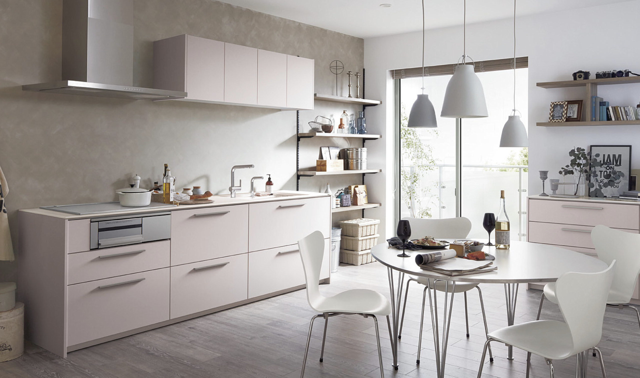 施工イメージ_扉オーブアッシュピンク×ワークトップクリスタルライトピンク_TOTOザクラッソカタログより_plan19