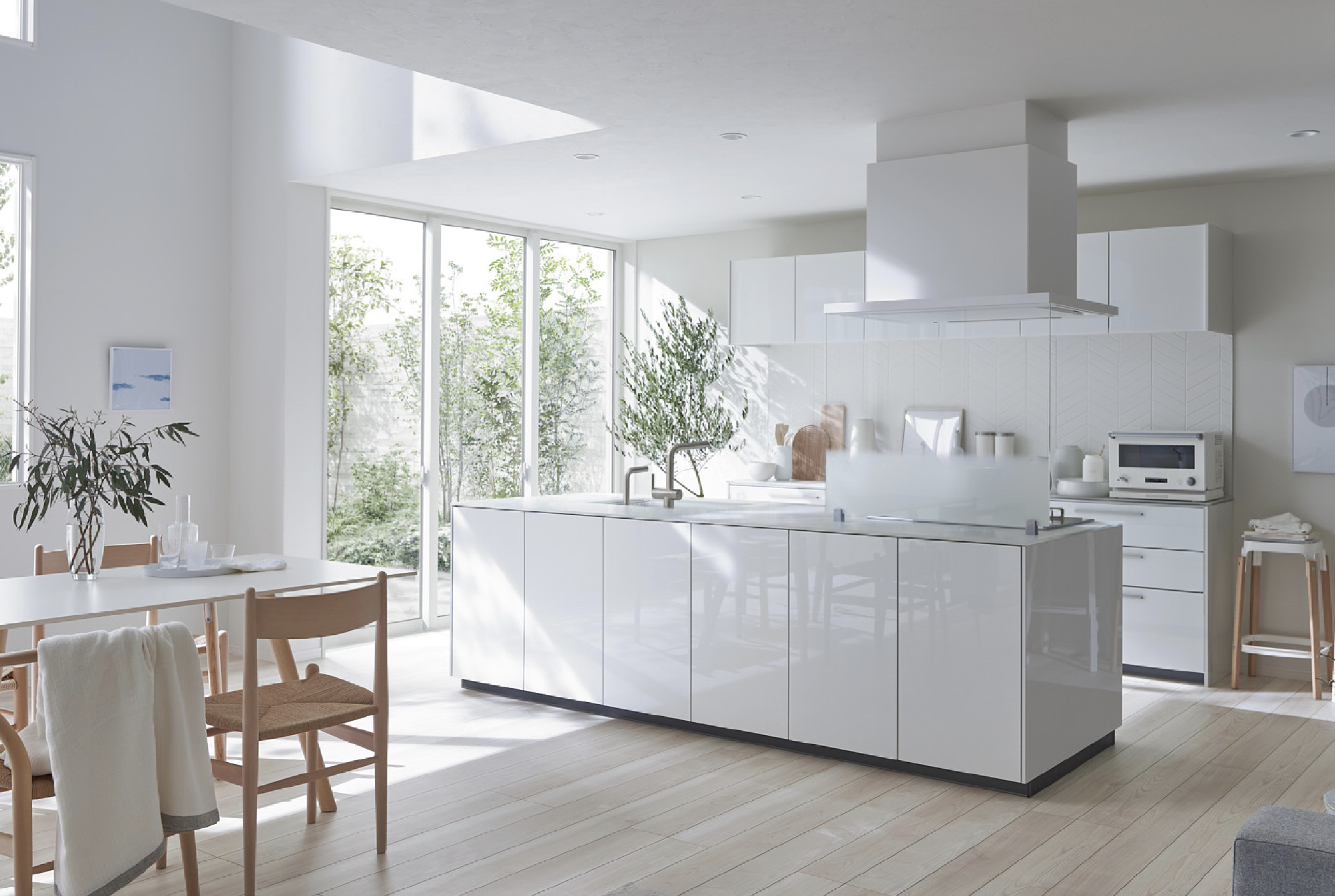 扉ペルラホワイト×ワークトップクリスタルペールグリーンのレイアウト事例画像_TOTOザクラッソカタログより_アイランドキッチン