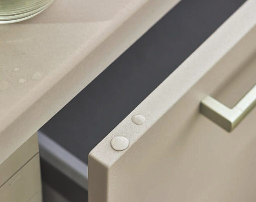 これらの天板の良いところは、セラミックカウンターのように硬質で、防汚・耐熱性も兼ね備え